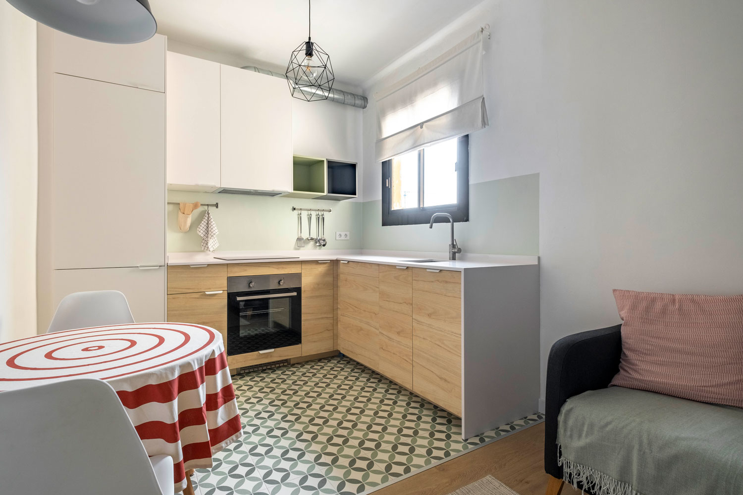 La reforma incluyó diseñar una cocina nueva, equipada y de materiales resistentes, cambiando los suelos, renovando el baño y conservando las puertas y armarios originales de madera noble.